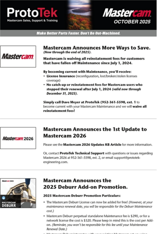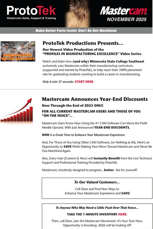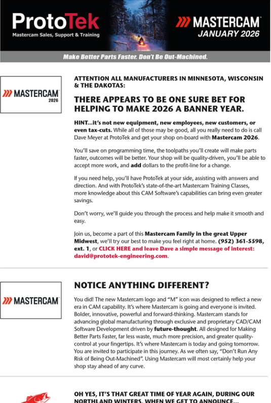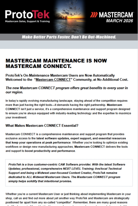Each month ProtoTek Engineering creates a current update in the form of a customer newsletter. Each piece contains pertinent and timely information regarding Mastercam updates, new product explanations and reviews, training schedules and other newsworthy information our customers and friends have come to rely upon for staying up-to-date regarding all things Mastercam. Here are the most current ProtoTek Engineering newsletters.